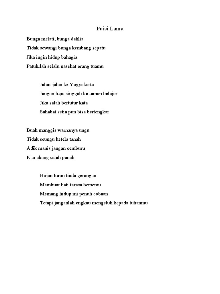 . Pantun adalah jenis puisi lama yang tiap baitnya terdiri atas empat baris serta memiliki sampiran dan isi. Pantun telah berkembang sebagai media penuturan pesan dengan permainan kata-kata. Berdasarkan puisi tersebut larik yang bermajas sama dintadai dengan nomor.